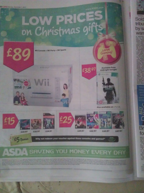 Originally there were reports that Asda would be selling Modern Warfare 3 for £26 or £27. However looking in the paper today I found the advert for which shows that they don’t have any offers on the game. So if you go to there to pick up the game you will be paying £38.97