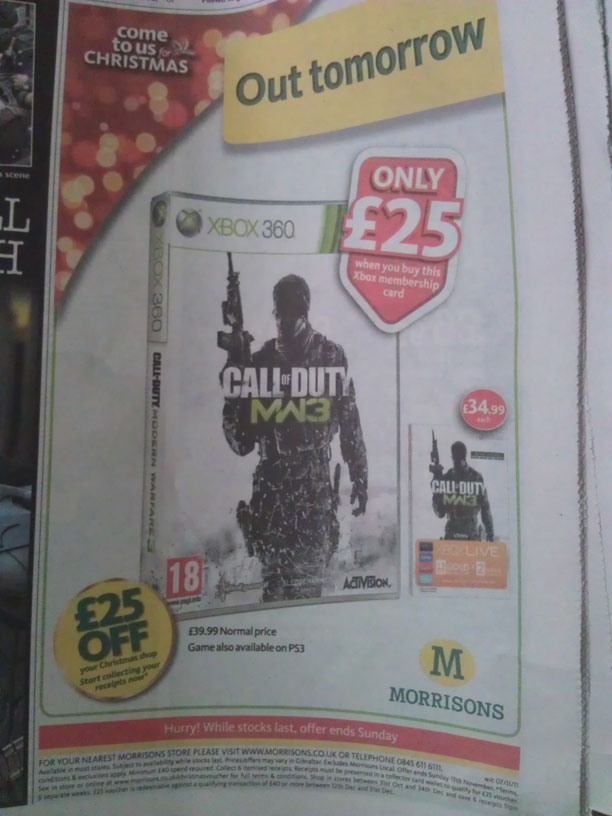 Morrison’s will only have a deal on the Xbox 360 version of the game. You can pick up the game for £25 when you buy it with the Modern Warfare 12+2 months Xbox Live subscription card for £34.99. Also they won’t be open at midnight.