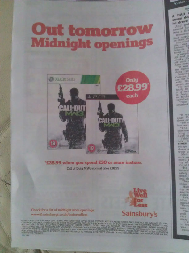 Sainsbury’s are doing a midnight launch and an offer. Modern Warfare 3 on either Xbox 360 or PlayStation 3 for £28.99 as long as you spend £30 or more in store with the game.