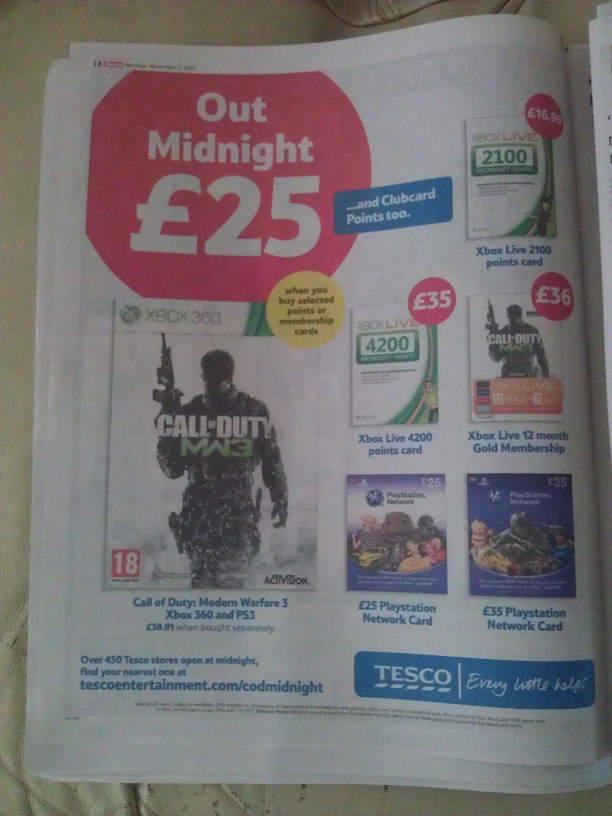 Tesco will also do a midnight launch are offering Modern Warfare 3 for £25 on PlayStation 3 or Xbox 360 if you also buy one of the following. 2100 Xbox points for £16.99, 4200 Xbox points for £35, 12+2 months Xbox Live £36, £25 PSN card or £35 PSN card.